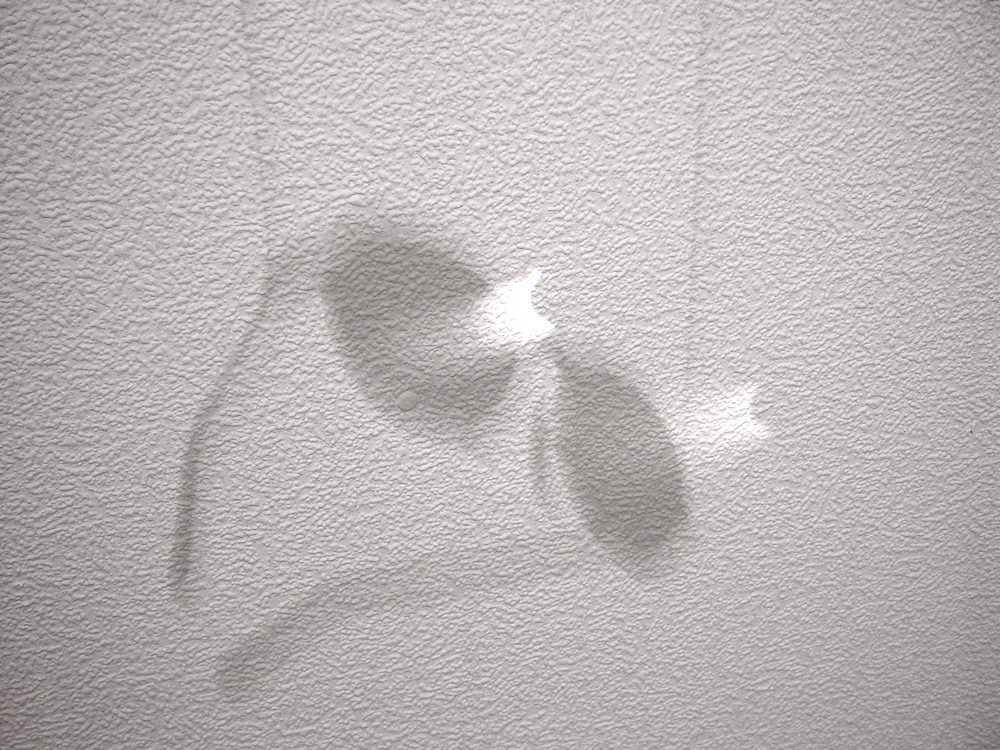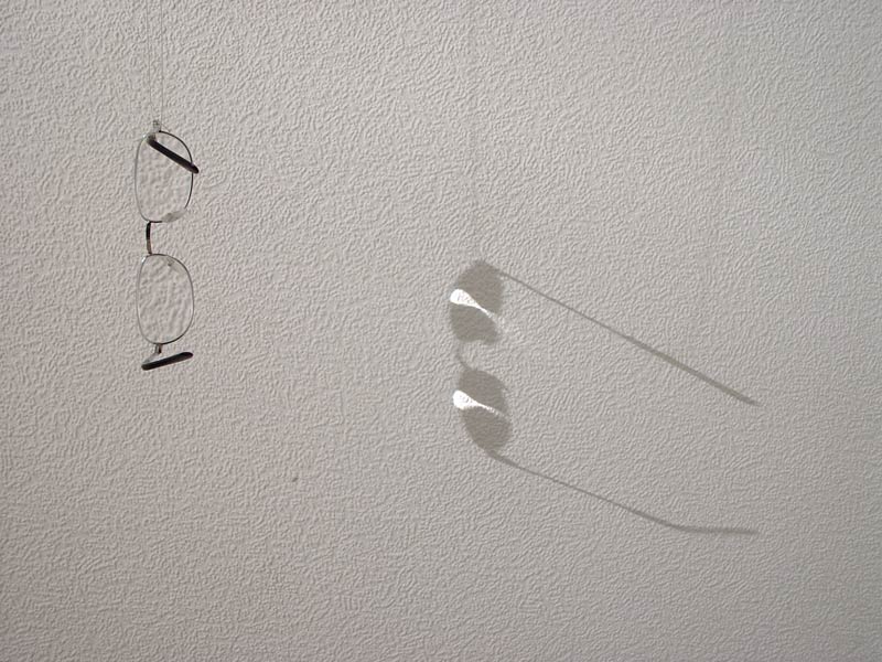 in a small room with no daylight and only an entrance door, one light bulb hangs from the ceiling. There are reading glasses in the room that leave their shadow and light projection on the wall. Location: Amsterdam