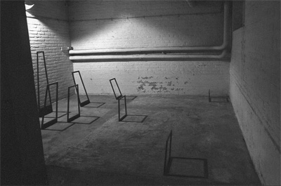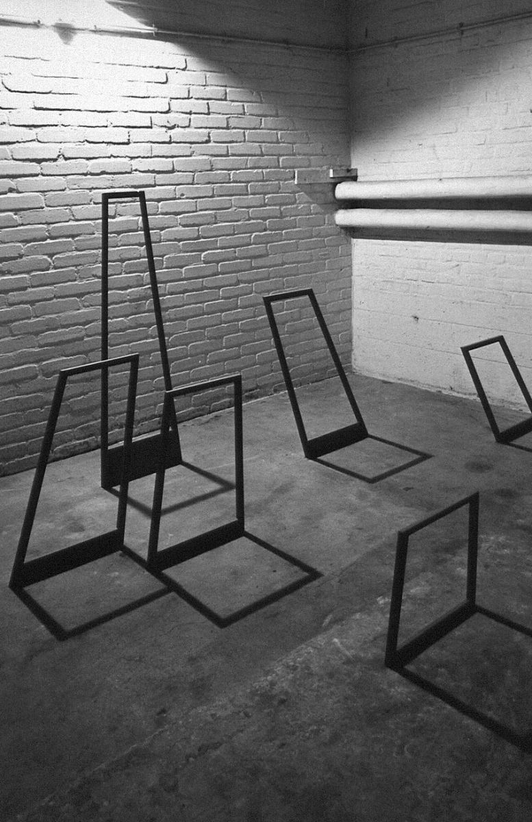 this is the artificial light part of the installation; one light bulb hung on the wall; the shape of the vertical objects was dictated by the shadow they had to throw: a square shadow of the same size.