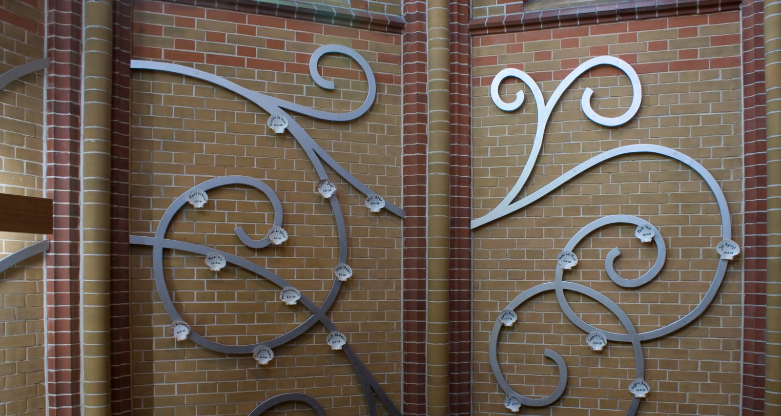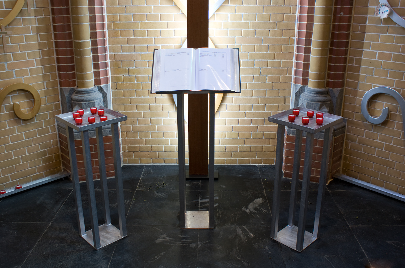 on the right are garlands in silver color, with the baptismal shells of the baptisms; left, the garlands in gold with crosses of the deceased; neon light has been applied behind the cross.