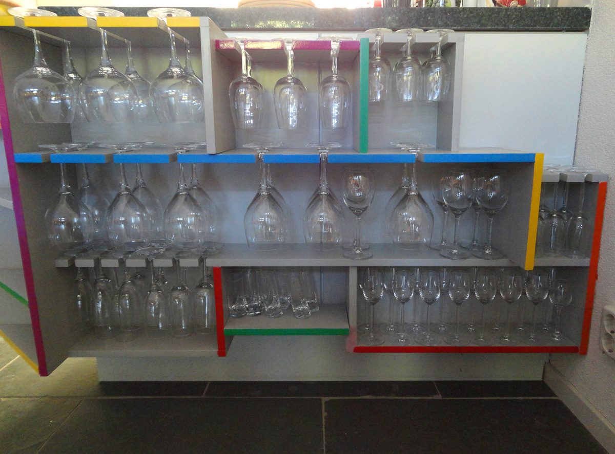 An additional box on the wall was undesirable, therefore, this design of a glass object to a kitchen unit. The size of the compartments are based on the number of glasses and the size of the glasses that had te be stored.